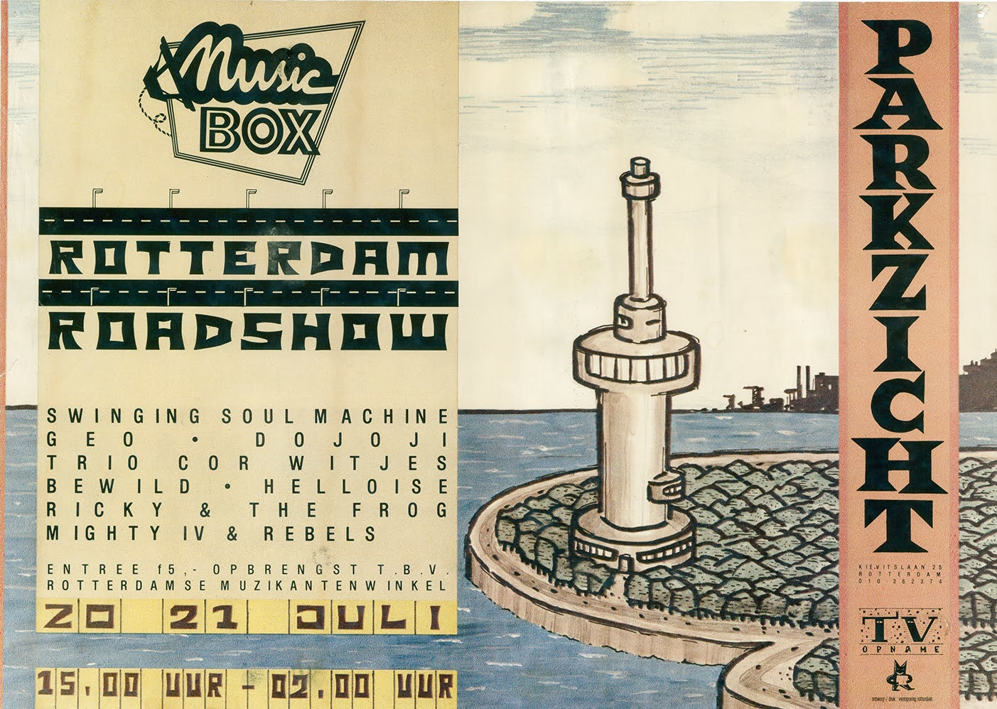 The new band members contributed to the repertoire which they perfected through live performances around the Netherlands. Some of the best GEO band songs emerged in those days. Surpisingly a new GEO album never materialized, although demos were recorded and recently some of these surfaced again. One of the higlights for the band was the live TV recording for the Music Box TV channel in Parkzicht Rotterdam on 21-7-1985. Picture below.