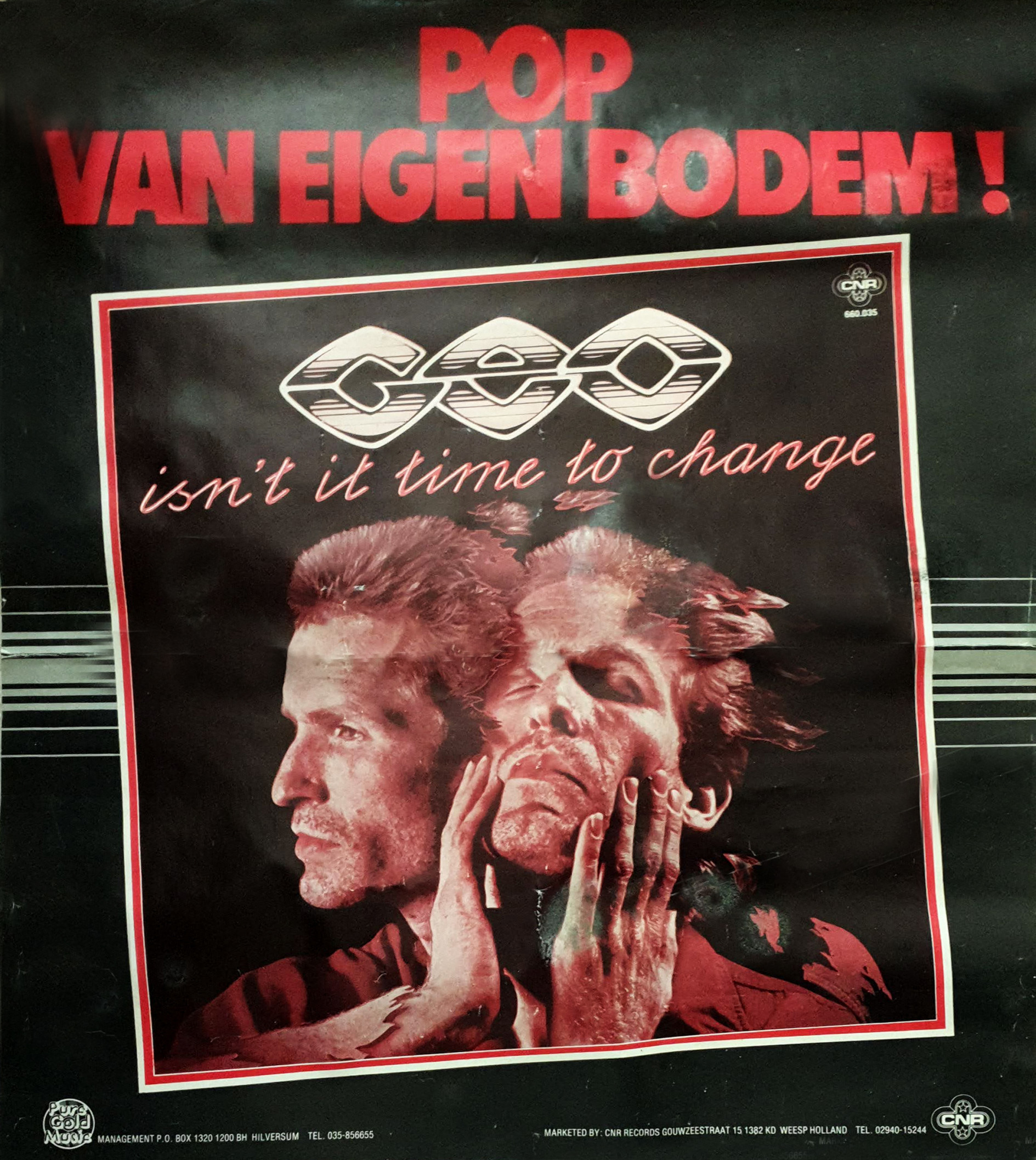 In 1976 GEO went solo and recorded his first solo album titled "Isn't It Time To Change". Produced by Eddy Ouwens the album was released in 1979 through CNR Records. It featured well know Dutch musicians of the time including Mac Sell (guitar), Paul Vink (keyboard) and Jan Hollestelle (bass), Ton op't Hoff (drums). Picture shows them performing live in De Trucker Pijnacker in 1979. A remastered version of the album was released on Spotify in 2021.